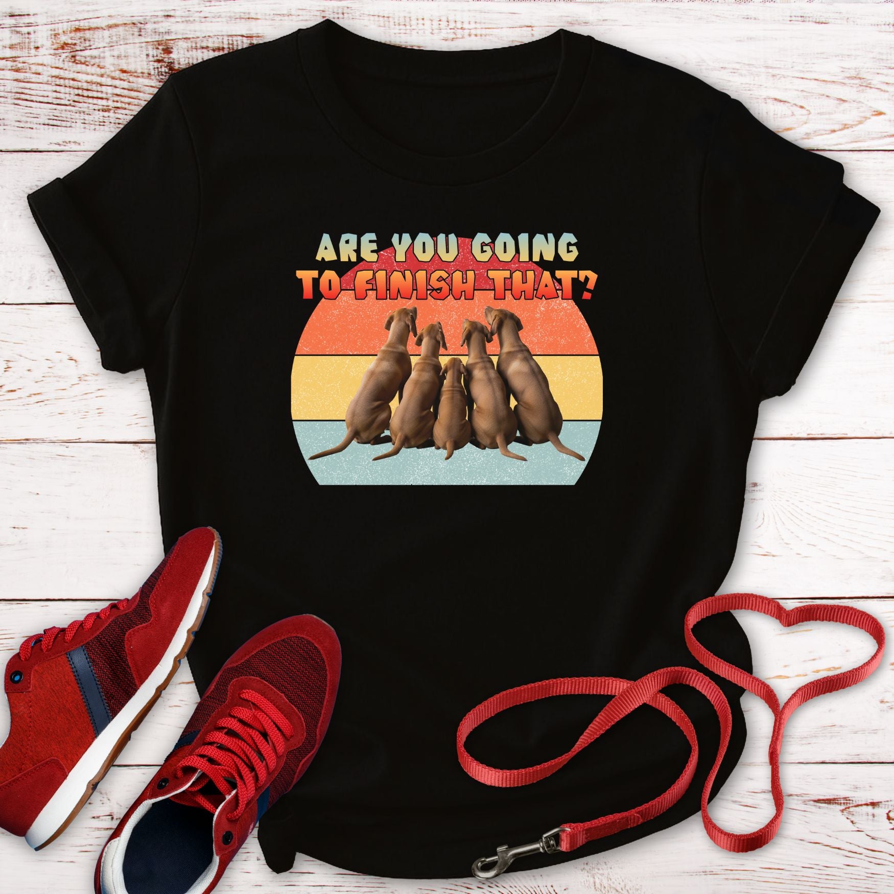 Prepare for instant laughter and endless commiseration from fellow dog owners with the hilarious and poignant "Are you going to finish that?" T-shirt! This fantastic design perfectly captures the relentless, hopeful gaze of a Vizsla pack. It features an unforgettable graphic of four Vizslas sitting politely on their butts, staring up at the wearer in full, pure, intense concentration. The accompanying text is bold, begging, and perfectly placed: "Are you going to finish that?", making it clear their focus is entirely on your snack.