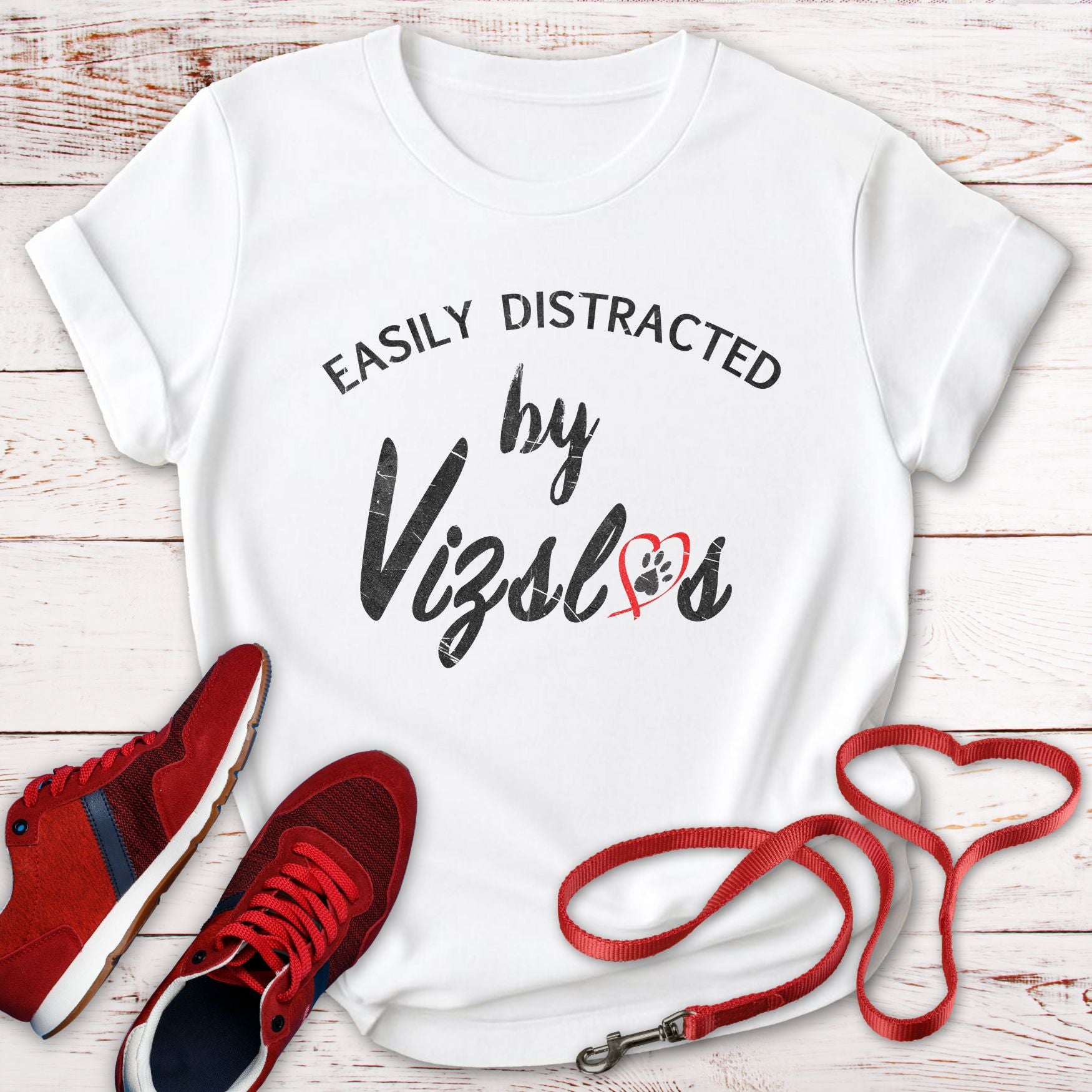If your focus instantly shifts the moment a gorgeous, russet-gold dog trots into view, this "Easily Distracted by Vizslas"T-shirt is your official uniform! This fun and loving design perfectly sums up the life of a Vizsla enthusiast. The text is clear and playful, but the true charm lies in the detail: the 'A' in "Vizslas" is replaced by a beautifully drawn heart wrapped around a Vizsla paw print, visually confirming that this distraction is fueled by pure love.