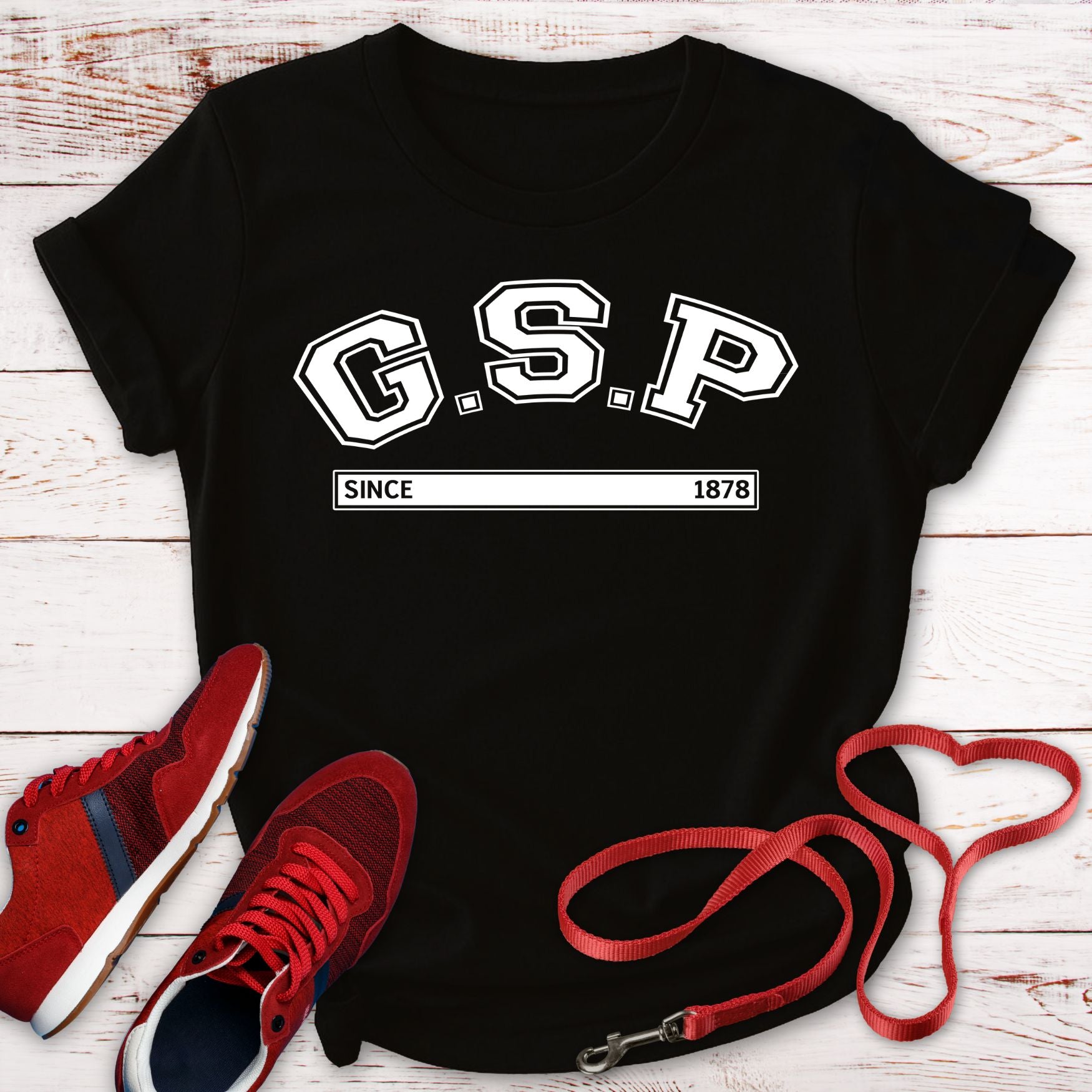 Step into history with our fun and proud "G.S.P. Since 1878" T-shirt! This unique design gives a stylish, historical nod to the hardworking and versatile German Shorthaired Pointer breed. The acronym "G.S.P." is featured prominently in a bold, classic college-style font, evoking the spirit of a prestigious university team. Directly beneath, the impactful text "since 1878" marks the approximate date the breed was formally recognized in Germany, asserting their impressive, over century-old hunting heritage.