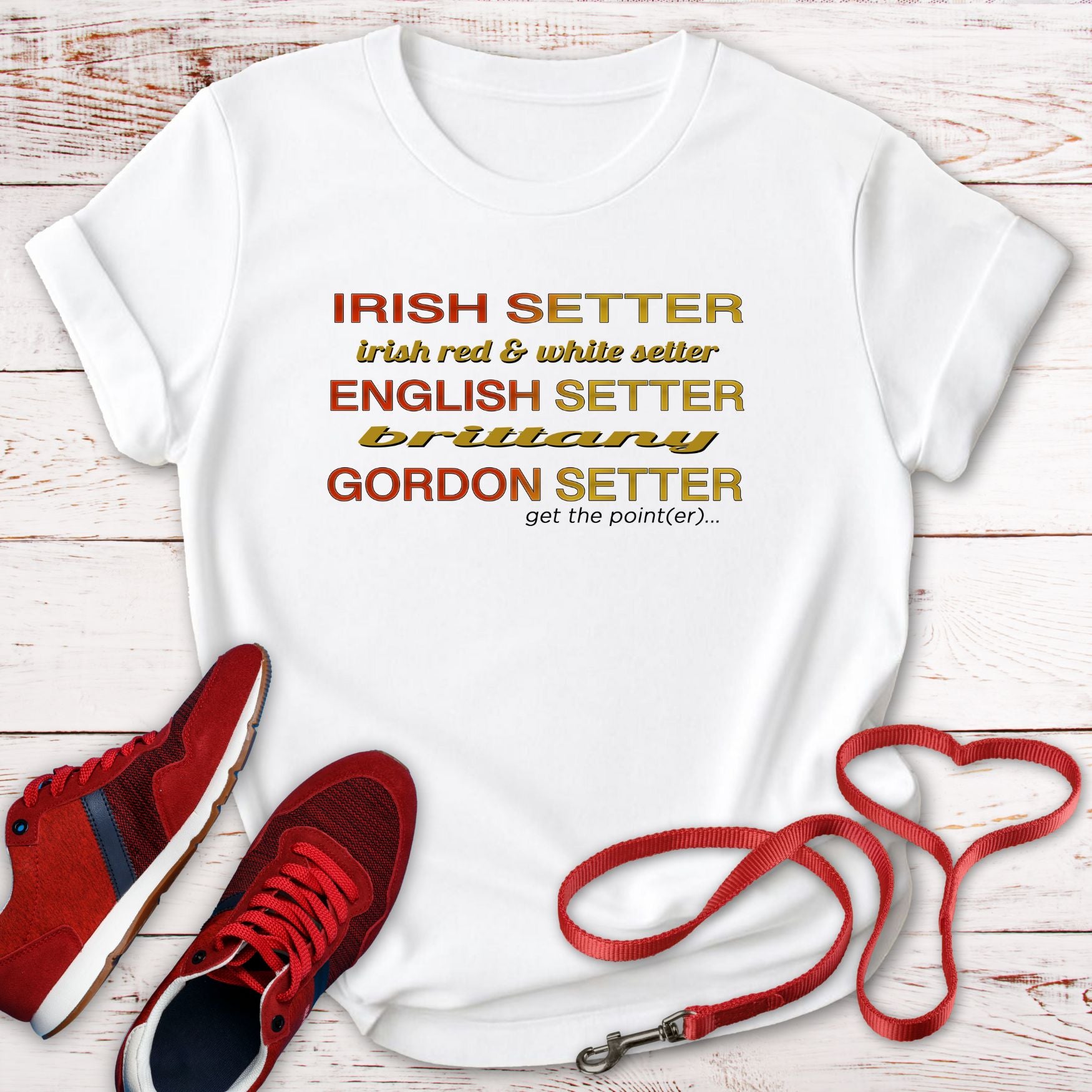 If you live for the elegance and intense loyalty of the Setter breeds, this "Get the Pointer..." T-shirt is your essential dog apparel! The simple yet striking design celebrates the magnificent family of pointing dogs, focusing on the beautiful Setters. It features a clean, bold list of beloved breeds, including the Irish Setter, Gordon Setter, English Setter, Irish Red & White Setter, and the Brittany. The phrase "get the pointer..." acts as a clever, knowing call-to-action, acknowledging that Setters, too, are masters of the point in the field.