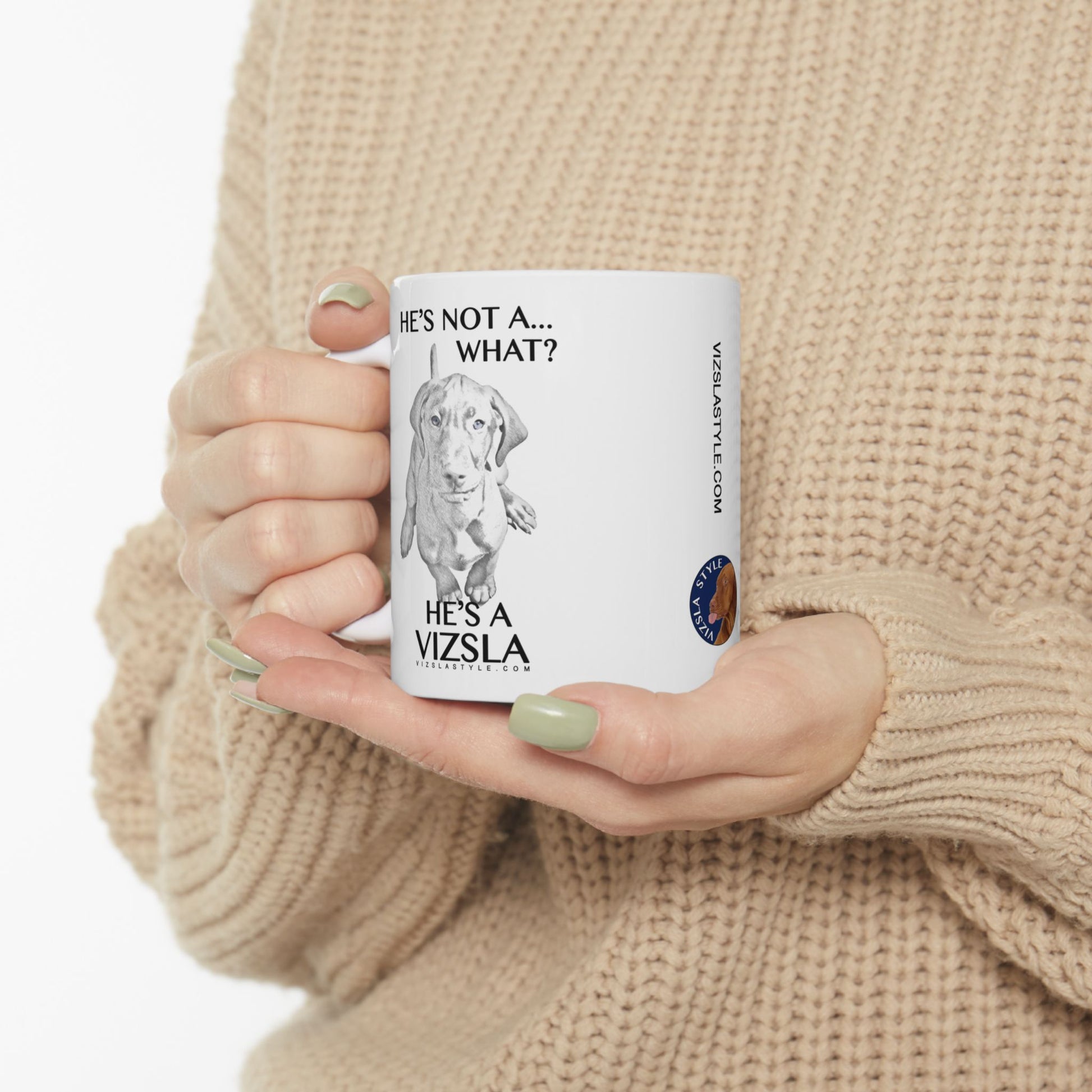Show your Love for your energetic Puppies with this "He's Not A What, He's A Vizsla" in beautiful Line Art with the "Vizsla Style" Logo - white ceramic mug!