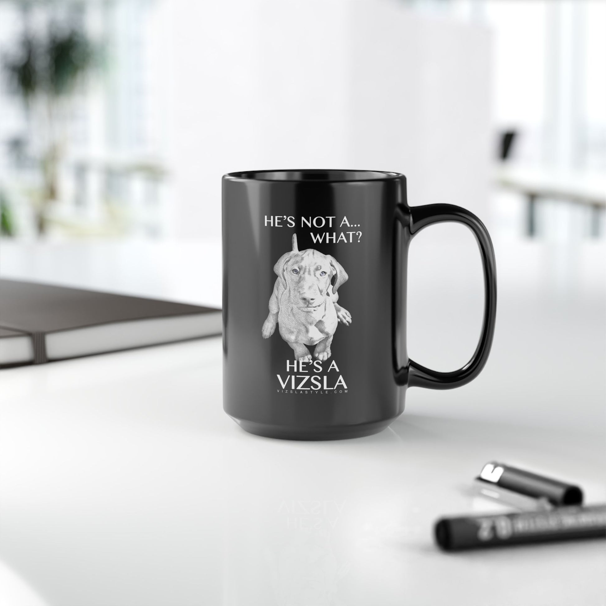 The "He's Not A... What? He's A Vizsla" black mug brings a stylish line art Vizsla looking deep into your eyes, along with the useful design to your kitchen, that brings the fun and joy of the Vizsla right into your life.