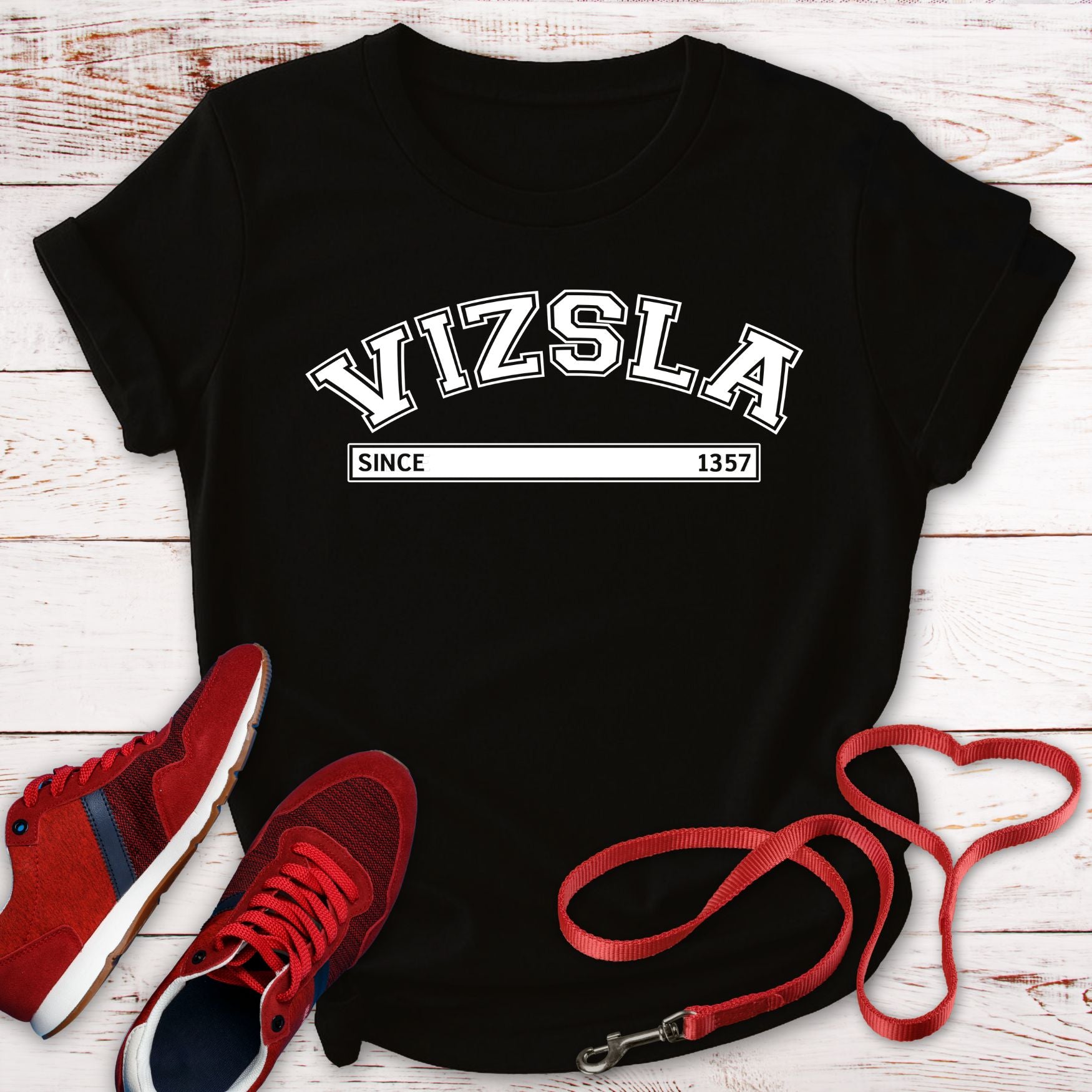 Step into history with our fun and proud "Vizsla Since 1357" T-shirt! This unique design gives a stylish, historical nod to the ancient and noble lineage of the Vizsla breed. The word "VIZSLA" is featured prominently in a bold, classic college-style font, evoking the feeling of a prestigious university sports team. Directly beneath, the impactful text "since 1357"marks the approximate date the breed was first recognized in Hungary, asserting their impressive, centuries-old royal hunting heritage.