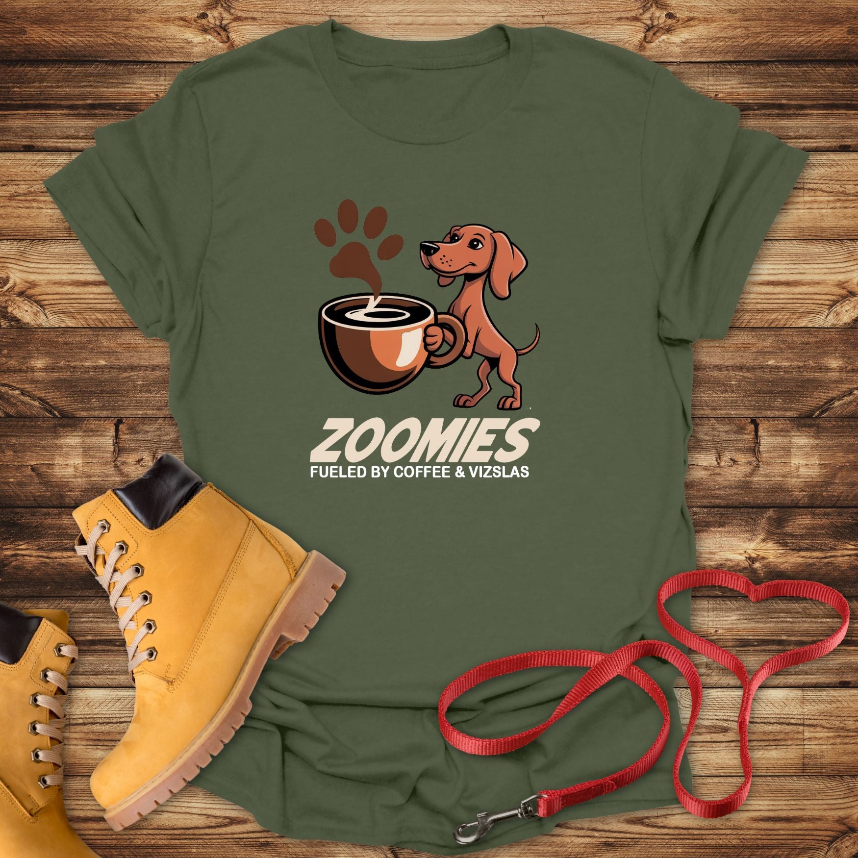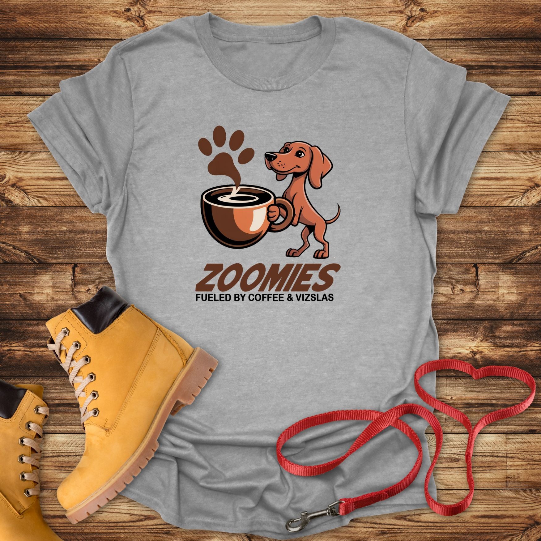 Get ready to celebrate your two main sources of daily momentum with the hilarious "ZOOMIES - fueled by coffee & vizslas" T-shirt! This fun design perfectly captures the energetic reality of life with a russet-gold companion. It features a witty graphic of a Vizsla, looking alert and ready for action, holding a steaming cup of coffee where the steam itself curls into the shape of a subtle paw print. The text is bold, simple, and direct, instantly communicating the chaotic, loving energy that drives your life.